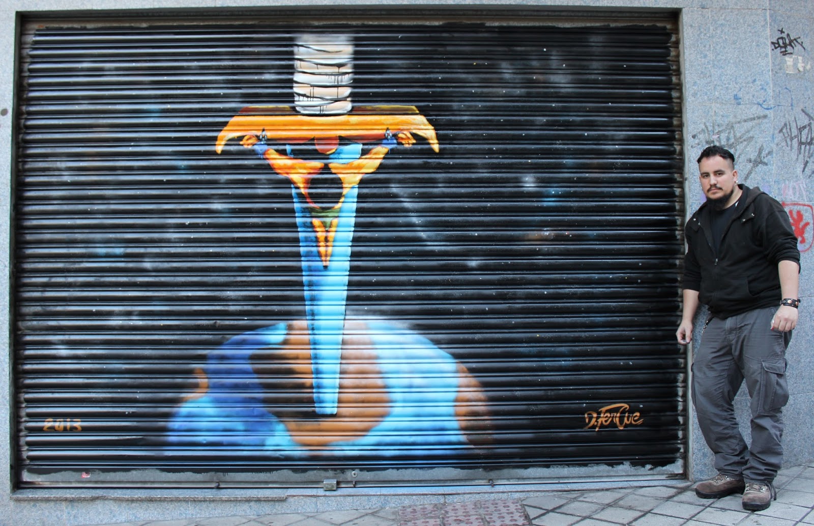 Los pasados días 7, 8 y 9 de Junio de 2013, tuve el orgullo de participar en un proyecto artístico de "Pintura urbana" en Salamanca. Es un proyecto mediante el cuál se crea una galería a pie de calle en la que se ofrecen varias puertas de garajes y tapas de comercios a jóvenes artistas para que las utilicen como lienzos en los que plasmar sus obras.